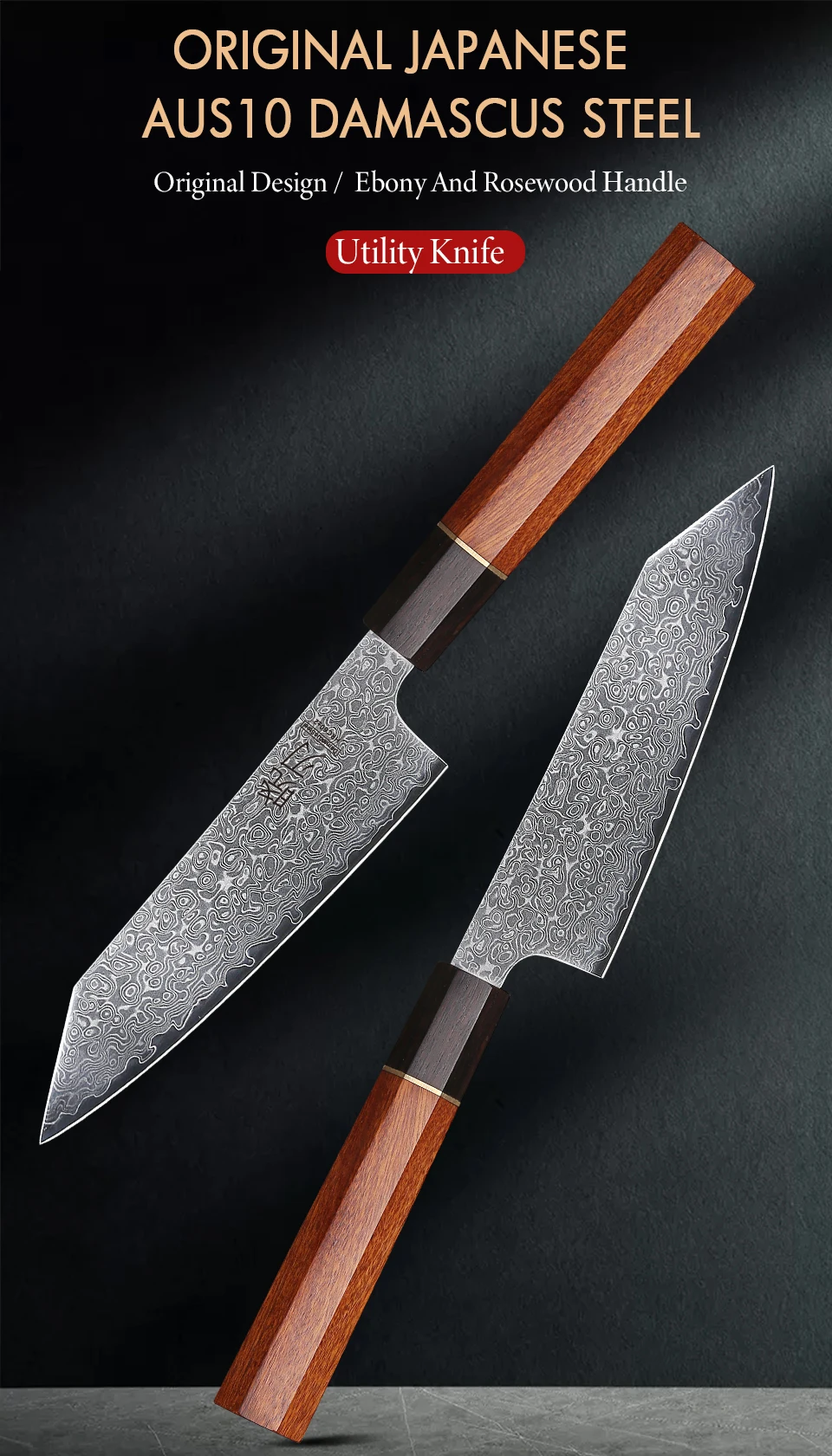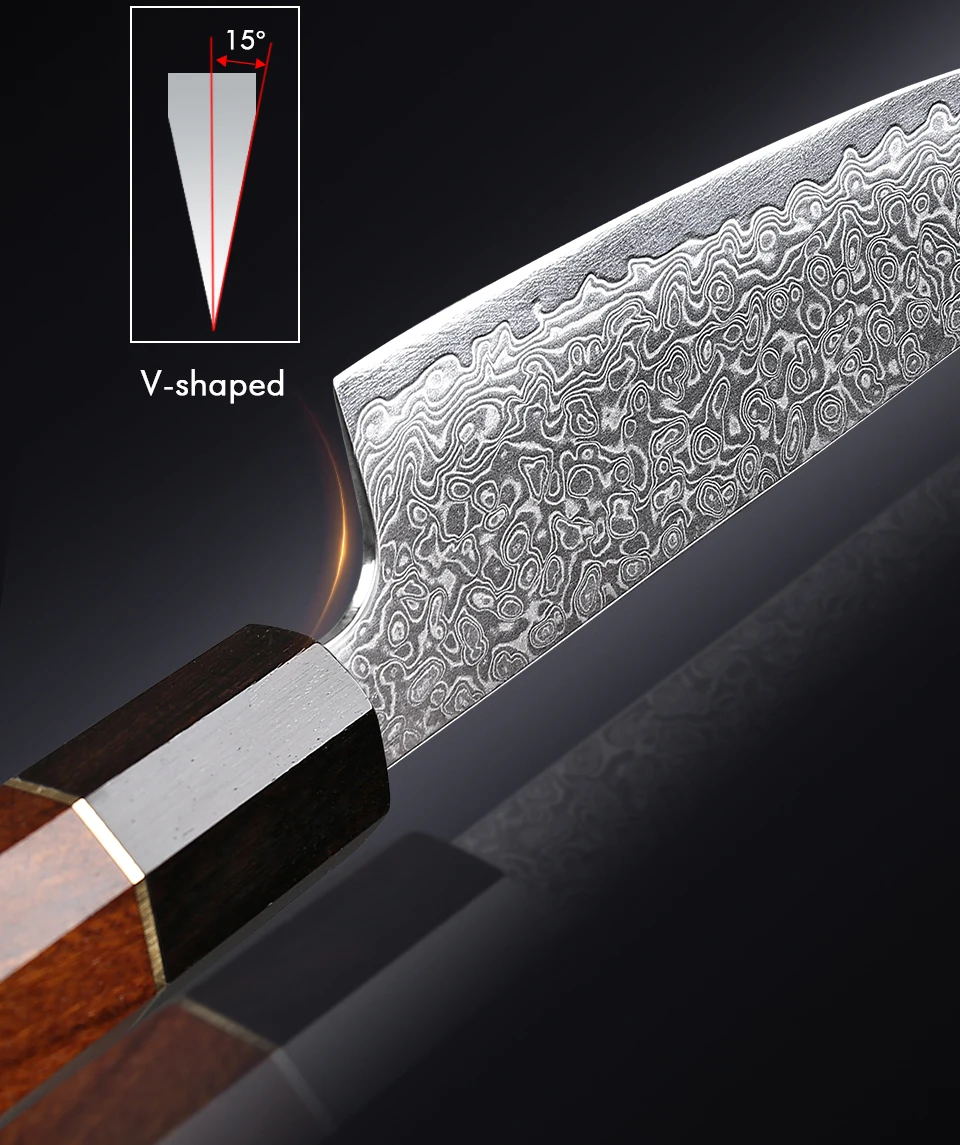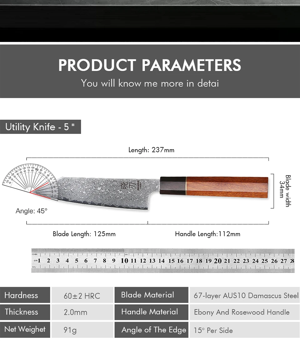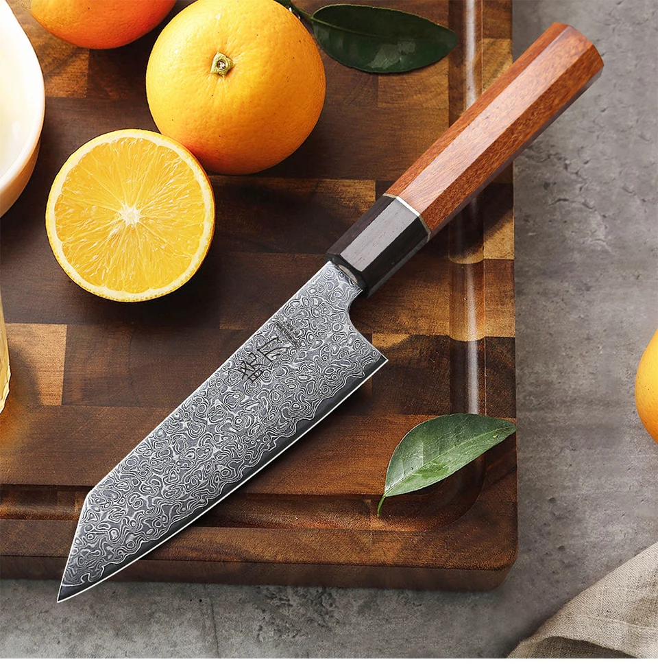 This 5-inch utility knife features a 67-layer Damascus steel blade with a sharp 15-degree edge, ideal for precise slicing of meat, vegetables, and fruits. Its ebony and rosewood handle with an AUS-10 steel core offers durability and balance. Lightweight and rust-resistant, it’s perfect for everyday kitchen tasks but not suitable for cutting bones or hard foods. Comes in a gift box, combining expert craftsmanship with practical use.