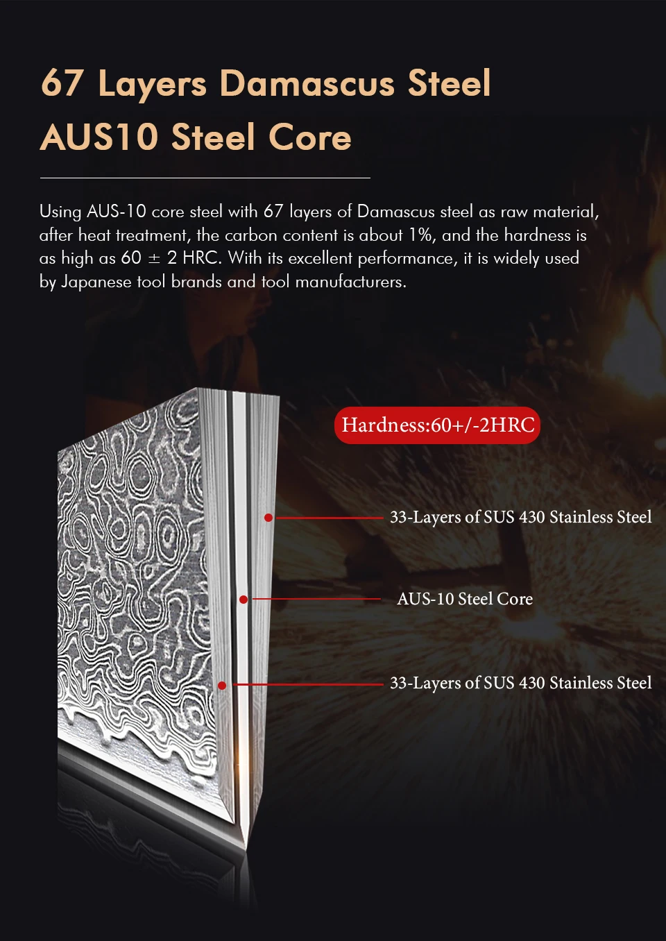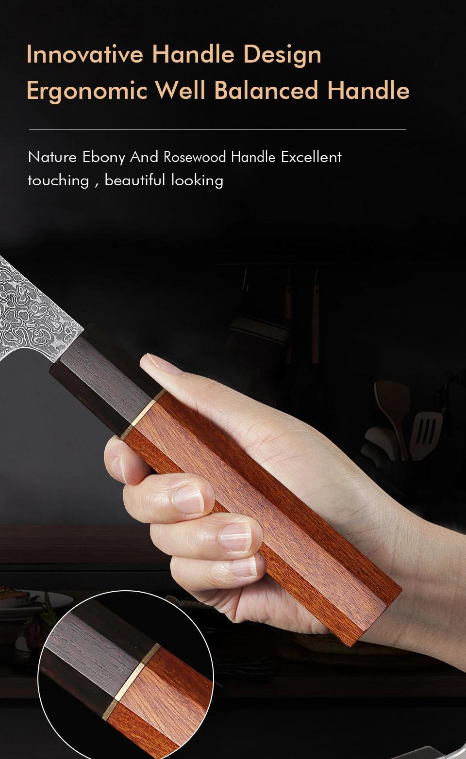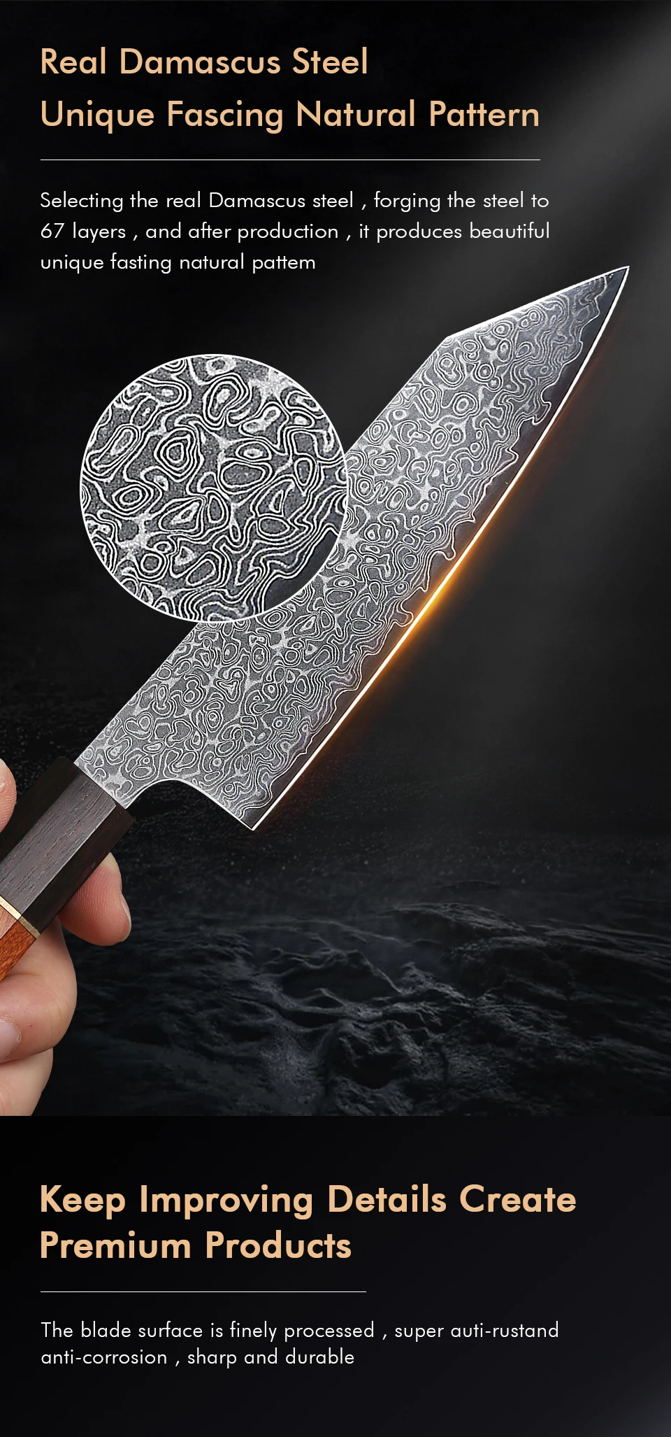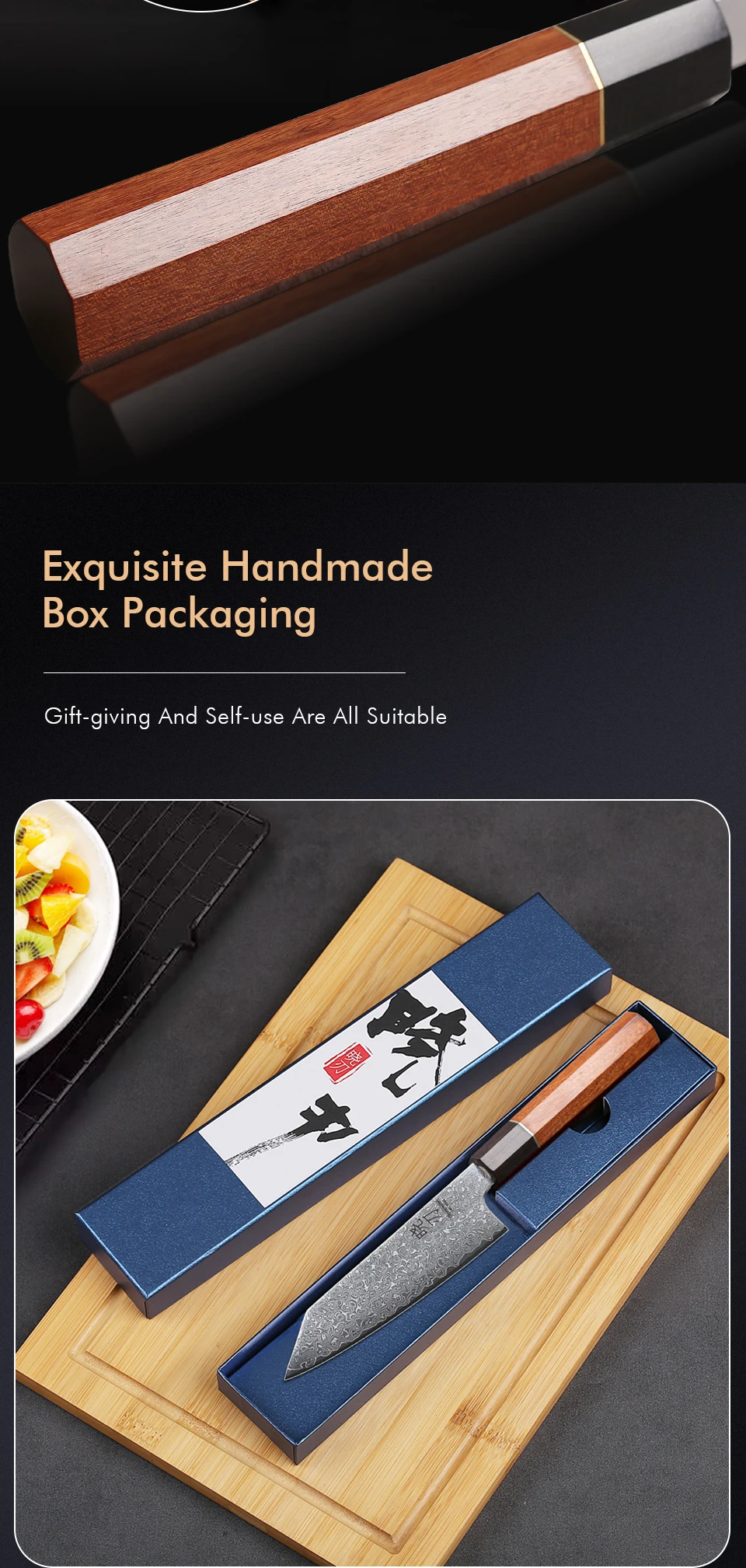 This 5-inch utility knife features a 67-layer Damascus steel blade with a sharp 15-degree edge, ideal for precise slicing of meat, vegetables, and fruits. Its ebony and rosewood handle with an AUS-10 steel core offers durability and balance. Lightweight and rust-resistant, it’s perfect for everyday kitchen tasks but not suitable for cutting bones or hard foods. Comes in a gift box, combining expert craftsmanship with practical use.