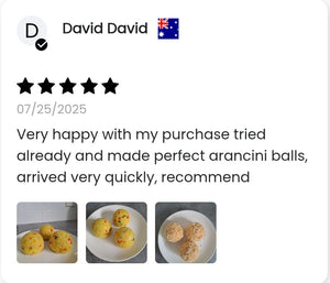 A: Fill the mold with cooked rice, insert any filling you like (e.g., cheese, ragù), then press and release—your arancino comes out perfectly shaped every time. The simple press-and-shape system makes dozens in minutes.
